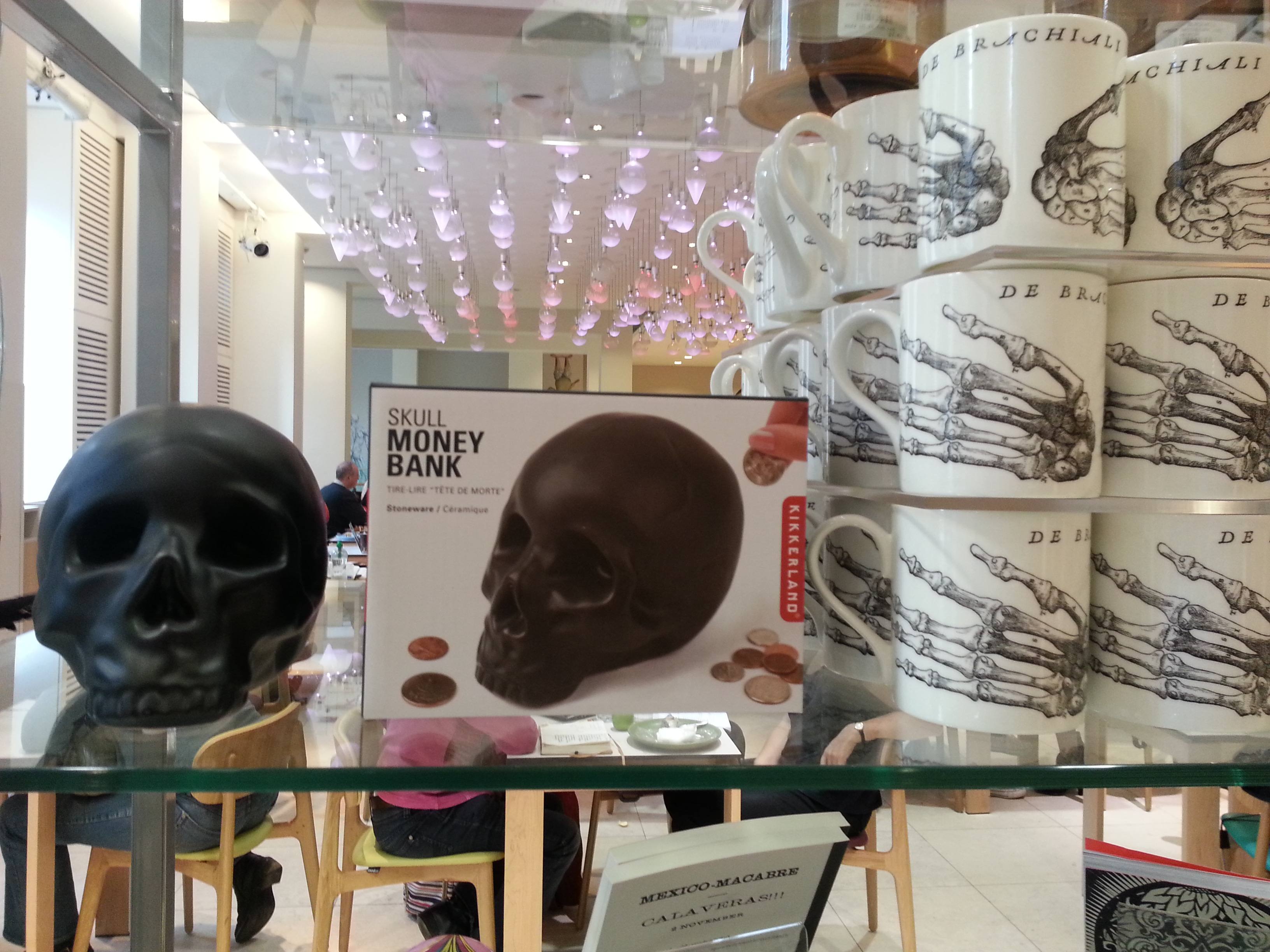 There are mugs festooned with pills, highlighters in the shape of syringes, skull money boxes and sparkly skull earrings (main picture) as well as book bags and coaster sets decorated with skeletons.